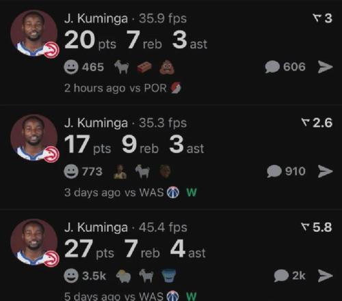 迄今為止庫明加為老鷹出戰(zhàn)三場比賽首發(fā)1次全部取勝,分別貢獻27分7板4助2斷、17分9板3助1斷1帽,和20分7板3助2斷,三戰(zhàn)投籃合計31中21,命中率高達約68%,其中三分球合計9中5,命中率達到約56%。