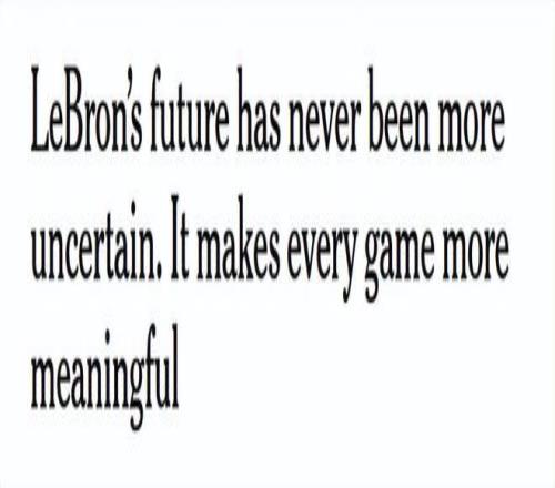 如今看他打球則截然不同,卻同樣激動(dòng)人心。詹姆斯身邊的消息源透露,他在全明星周日對(duì)記者說(shuō)的那句“我不知道自己的未來(lái)會(huì)怎樣”是認(rèn)真的。隊(duì)友和教練都在猜測(cè)他下一步會(huì)做什么,但沒有任何人有確切答案。