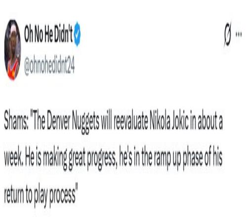 Shams在幾周前曾透露,掘金隊對約基奇能在本月底前復(fù)出持樂觀態(tài)度。盡管如今看來,這一時間節(jié)點恐難實現(xiàn),但他同時表示,這位老將中鋒的康復(fù)過程并未遭遇任何波折,目前恢復(fù)情況“進展十分順利”,正處于復(fù)出流程的“強度提升階段”。