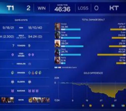 電競體育01月23報道 T1 2:0 KT,賽后數(shù)據(jù)面板顯示T1在落后13.9k經(jīng)濟差的情況下最終翻盤比賽。