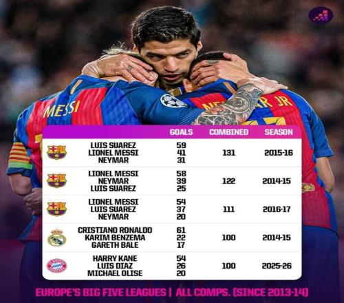 這是自2013-14賽季以來進(jìn)攻三人組第五次合力進(jìn)球上百,而拜仁的三人組則是達(dá)成此成就的第三組球員。