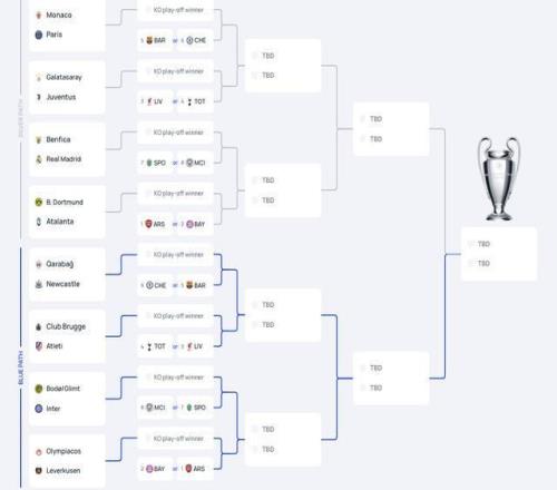 在聯(lián)賽階段結(jié)束后,1/8決賽的四組分區(qū)也已經(jīng)確定。不過今晚不會確定1/8決賽的具體對陣情況,1/8決賽抽簽將在附加賽結(jié)束后,于北京時間2月27日晚間進行。但直通1/8決賽的球隊已經(jīng)得知了自己的4個潛在對手。