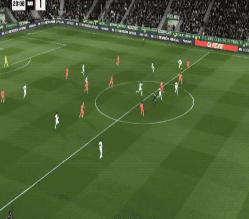 第29分鐘,巴薩防線站位太過靠前,阿爾瓦羅反越位成功,冷靜破門,將比分扳平。
