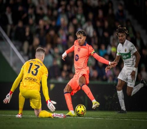 面對本賽季首回合交鋒,1-3敗在自己腳下的埃爾切,弗蘭克在客場沿用了433的陣型,霍安加西亞鎮(zhèn)守龍門,孔德、庫巴西、加西亞和巴爾德構(gòu)筑后防,費(fèi)爾明、德容和奧爾莫坐鎮(zhèn)中場,鋒線三叉戟則是亞馬爾、費(fèi)蘭和拉菲尼亞。