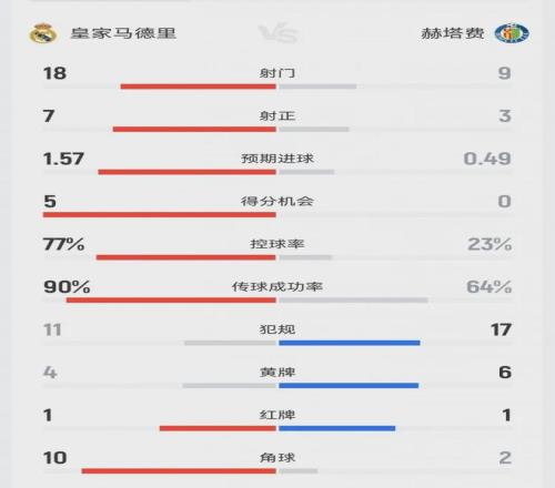 賽后的數(shù)據(jù)統(tǒng)計(jì)荒誕得像個(gè)笑話:皇馬控球率77%,射門18次,射正7次,預(yù)期進(jìn)球(xG)高達(dá)1.57,角球10個(gè);而赫塔費(fèi)呢?控球率僅23%,射門9次,射正3次。