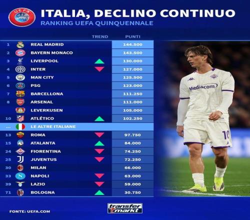 糟糕的歐戰(zhàn)表現(xiàn)也影響到了俱樂部及意甲整體的歐戰(zhàn)積分情況。