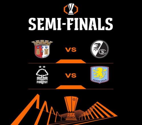 歐聯(lián)杯半決賽對(duì)陣為:弗賴堡vs布拉加;阿斯頓維拉vs諾丁漢森林。