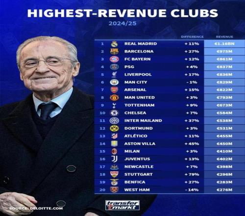 2425賽季俱樂部收入榜發(fā)布:英超9隊上榜西甲靠皇馬巴薩撐門面