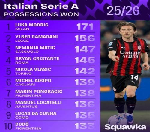本賽季意甲奪回球權(quán)榜:40歲莫德里奇171次第一,馬蒂奇第三