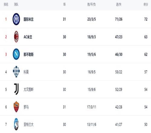 在積分榜上,國際米蘭以72分高居榜首,戰(zhàn)績是23勝3平5負(fù)。AC米蘭排名第2,只拿到63分。國際米蘭在多賽一場的情況下領(lǐng)先AC米蘭9分。這樣的領(lǐng)先優(yōu)勢很大了。冠軍恐無懸念。那不勒斯排名第3,拿到62分。第4名的是法布雷加斯率領(lǐng)的大黑馬科莫,拿到57分。尤文圖斯54分排第5。羅馬輸球之后,依然是54分,排名第6,想要獲得歐冠資格難度變得更大了。