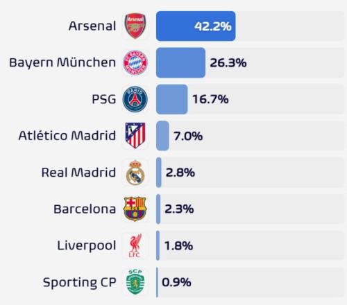 歐冠奪冠概率:阿森納42%一騎絕塵!拜仁第2皇馬僅2.8%