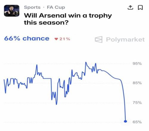而阿森納歐冠奪冠概率為26%,本賽季至少1冠的概率也從96%跌至65%。也就是說,曾有望4冠王的阿森納,現(xiàn)在竟然有接近4成的可能賽季0冠。
