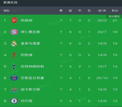 第七輪結(jié)束時(shí),已經(jīng)確定提前出線的阿森納和拜仁排名前二,皇馬和利物浦同積15分排名第三、第四,托特納姆熱刺14分第五,而巴黎、紐卡和切爾西同積13分排名六至八名。