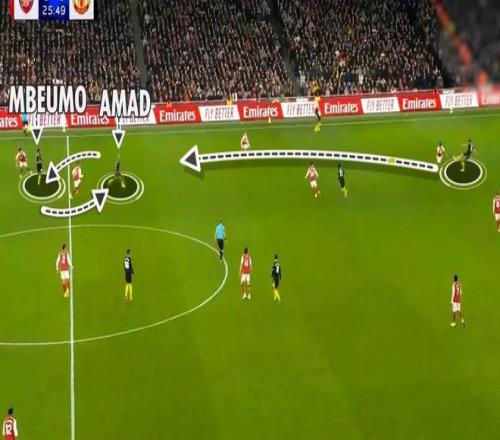 姆貝莫、阿馬德和B費(fèi)在右路,也踢得非常高效。B費(fèi)牽制了阿森納中衛(wèi)薩利巴,但阿馬德和姆貝莫因此得到了在威脅區(qū)域接球的機(jī)會(huì)。因此,當(dāng)曼聯(lián)進(jìn)攻時(shí),阿森納的防守陷入了真正的混亂。蘇比門迪的烏龍助攻,就是阿森納被逼進(jìn)他們不想進(jìn)入的領(lǐng)域的結(jié)果。