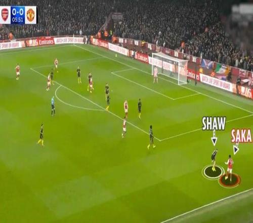 多古打邊鋒的一大優(yōu)勢(shì),是他在防守中也有貢獻(xiàn),回撤形成雙保險(xiǎn),讓盧克·肖可以放心在外側(cè)一對(duì)一防守薩卡。