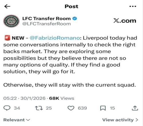 羅馬諾:利物浦昨天在內(nèi)部碰了一下,想看看右后衛(wèi)的市場。他們正在探索一些可能性,但認(rèn)為有質(zhì)量的選擇不多。如果能找到一個(gè)好的解決方案,他們就會(huì)去做。否則,利物浦將保持現(xiàn)有陣容。