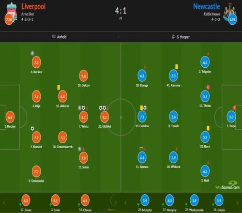 本場(chǎng)比賽紐卡在安菲爾德球場(chǎng)率先取得進(jìn)球,但是沒(méi)有頂住利物浦的反撲,眼睜睜看著?;倏松涎菝烽_(kāi)二度,維爾茨和科納特下半場(chǎng)分別建功,最終利物浦4-1逆轉(zhuǎn)獲勝,賽季雙殺紐卡斯?fàn)柭?lián)隊(duì),此役送出一次助攻的薩拉赫,19次面對(duì)紐卡貢獻(xiàn)10粒進(jìn)球和10次助攻,成為了英超歷史上唯一對(duì)陣單一對(duì)手進(jìn)球和助攻全部上雙的球員。