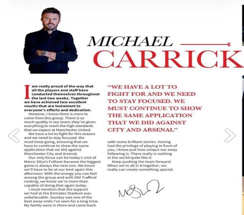 曼聯(lián)取得兩連勝后排名英超第四,但切爾西和利物浦本輪取勝后,已經(jīng)暫時超越紅魔,卡里克和他的球隊必須在剩余15場比賽取得好結(jié)果,才能確保重獲歐冠資格。卡里克并未因為接連擊敗強隊而沾沾自喜,他知道馬爾科·席爾瓦的富勒姆會帶來與瓜迪奧拉的曼城、阿爾特塔的阿森納不同的挑戰(zhàn)。