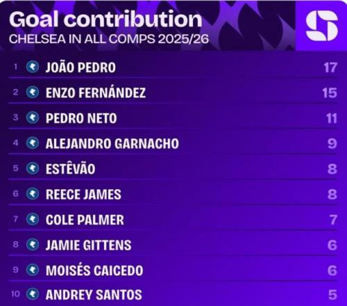 他不僅頭球扳回一城,更在最后時(shí)刻冷靜助攻恩佐絕殺,據(jù)Squawka統(tǒng)計(jì),他成為自2022年9月奇爾維爾之后,首位在英超替補(bǔ)登場(chǎng)完成傳射的切爾西球員。他以17次參與進(jìn)球領(lǐng)跑全隊(duì),是切爾西進(jìn)攻端最可靠的終結(jié)者。