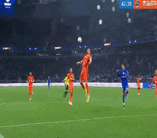 第14分鐘,高天意中路包抄頭球攻門,牟鵬飛撲球脫手隨后抱住。