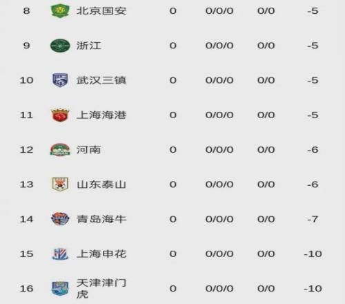 中超積分榜:申花津門(mén)虎10分墊底,長(zhǎng)春亞泰中甲4分墊底