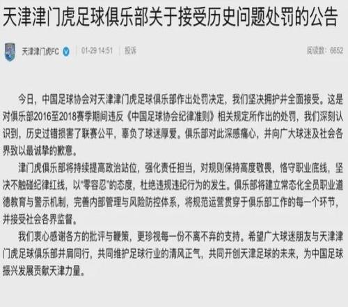 上海海港、上海申花、天津津門(mén)虎回應(yīng)接受處罰