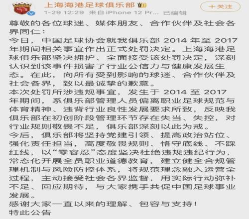 過(guò)去三個(gè)賽季的中超冠軍上海海港表示“全面接受該處罰決定”。