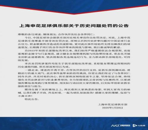 過(guò)去兩個(gè)賽季的中超亞軍上海申花官方表示“尊重并接受處罰?!?/p>