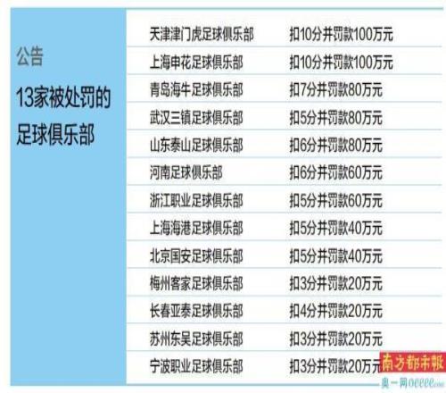 13家俱樂部被扣聯(lián)賽積分并罰款