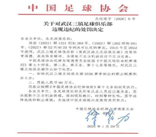 北京時(shí)間1月30日,武漢三鎮(zhèn)就被扣分一事發(fā)文道歉,表示誠懇接受處罰決定。至此,9支被罰的中超球隊(duì)仍有4隊(duì)沒有發(fā)...