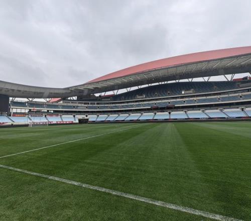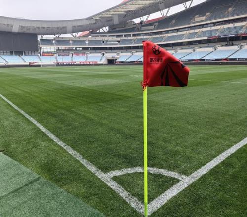 目前南京奧體中心內(nèi)場已經(jīng)布置好了超級杯的相關(guān)物料,場地草皮也較為平整。