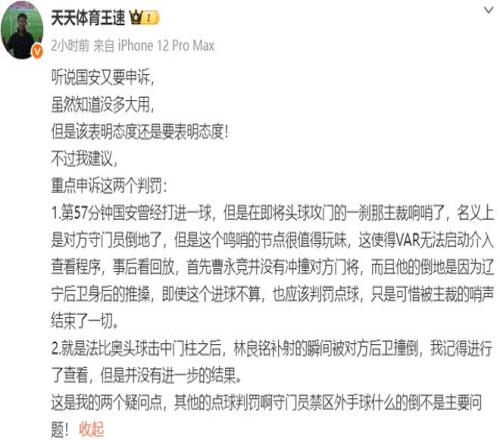 那么這場(chǎng)比賽的判罰有沒有讓北京國(guó)安方面產(chǎn)生異議呢?比賽結(jié)束后第二天,京媒天天體育的名嘴王速在個(gè)人社交平臺(tái)上寫道(上圖):“聽說國(guó)安又要申訴,雖然知道沒多大用,但是該表明態(tài)度還是要表明態(tài)度!” 目前北京國(guó)安的申訴點(diǎn)是啥外界不得而知,不過王速認(rèn)為應(yīng)該針對(duì)這兩點(diǎn)。